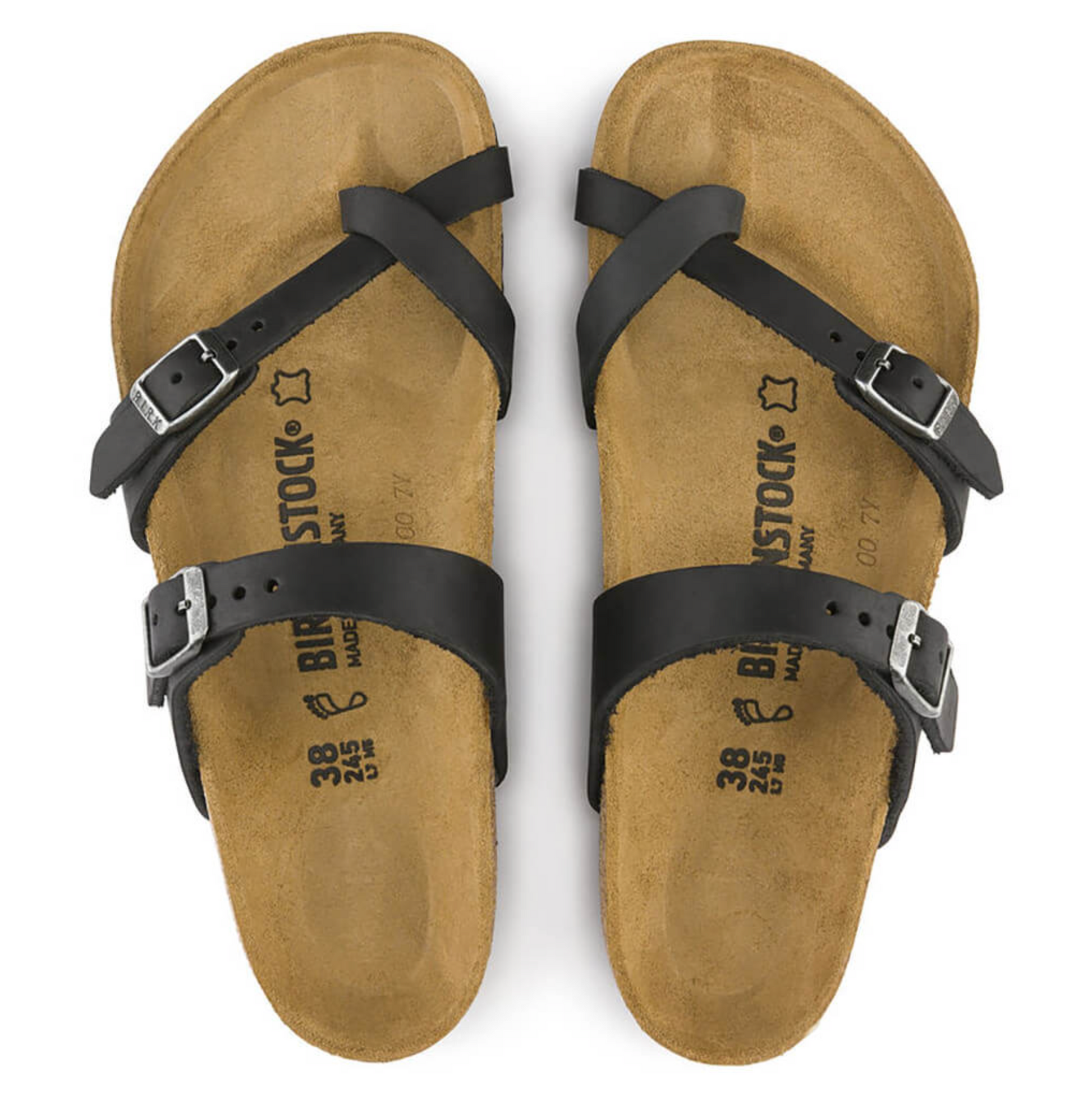The BIRKENSTOCK Mayari thong sandal is a modern model with a toe loop. The impressive combination of design and wearability will see fashion-conscious men and women through the day with elegance and comfort. The upper is made from extra thick, oiled nubuck leather with an open-selvage finish.