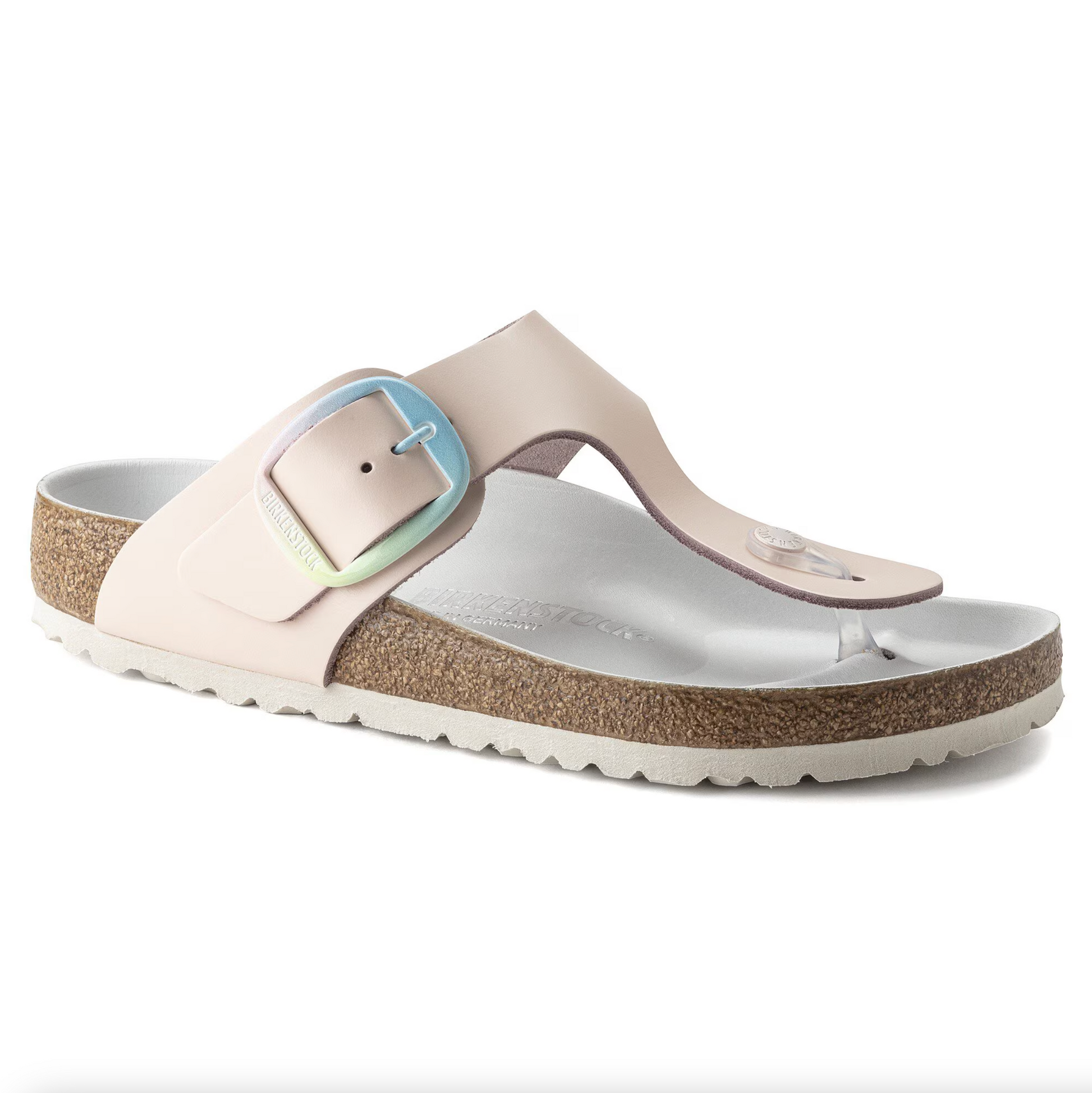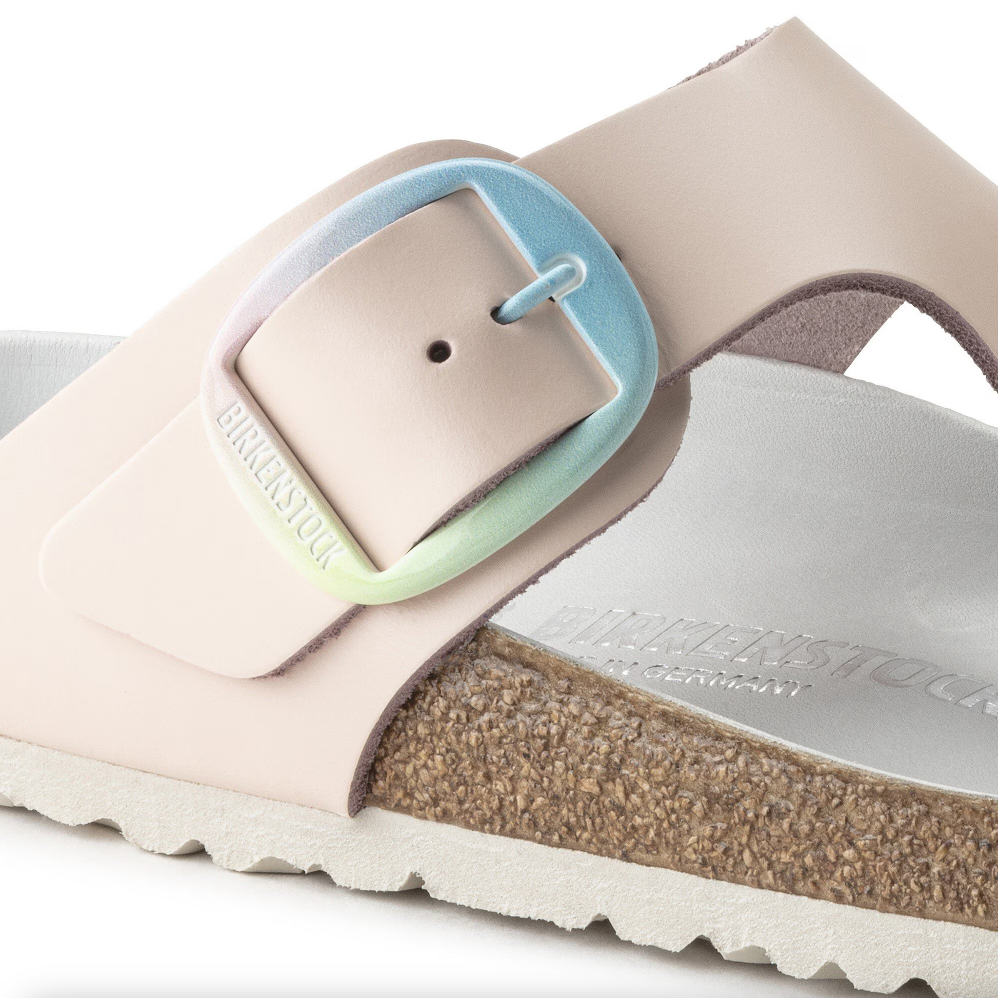 The BIRKENSTOCK Gizeh is a genuine classic that combines optimum grip with minimalist, fashionable design. This version features our popular Big Buckle with a rainbow effect – a fantastic, striking eye-catcher on this otherwise understated sandal. The color-coordinated semi-exquisite footbed is fully lined with soft piumato leather, making it exceptionally comfortable. The upper is made from high-quality aniline leather.