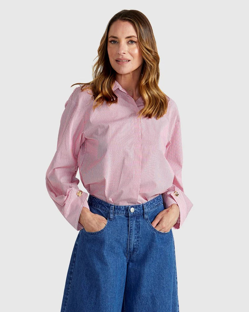 The Madras Shirt is a chic and refined addition to your wardrobe. With gold organic button detail and a concealed button placket, this shirt has an elevated, sophisticated feel. Its relaxed fit, along with the back pleat detail, makes it a perfect piece for stylish winter layering.