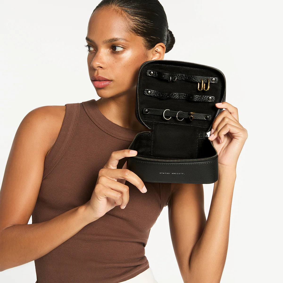 A nifty little case for all your precious personal stuff, such as necklaces, rings, earrings, watches, bracelets etc. The easy snap button straps will keep your rings / earrings neatly arranged on the top flap and throw larger items into the main compartment.