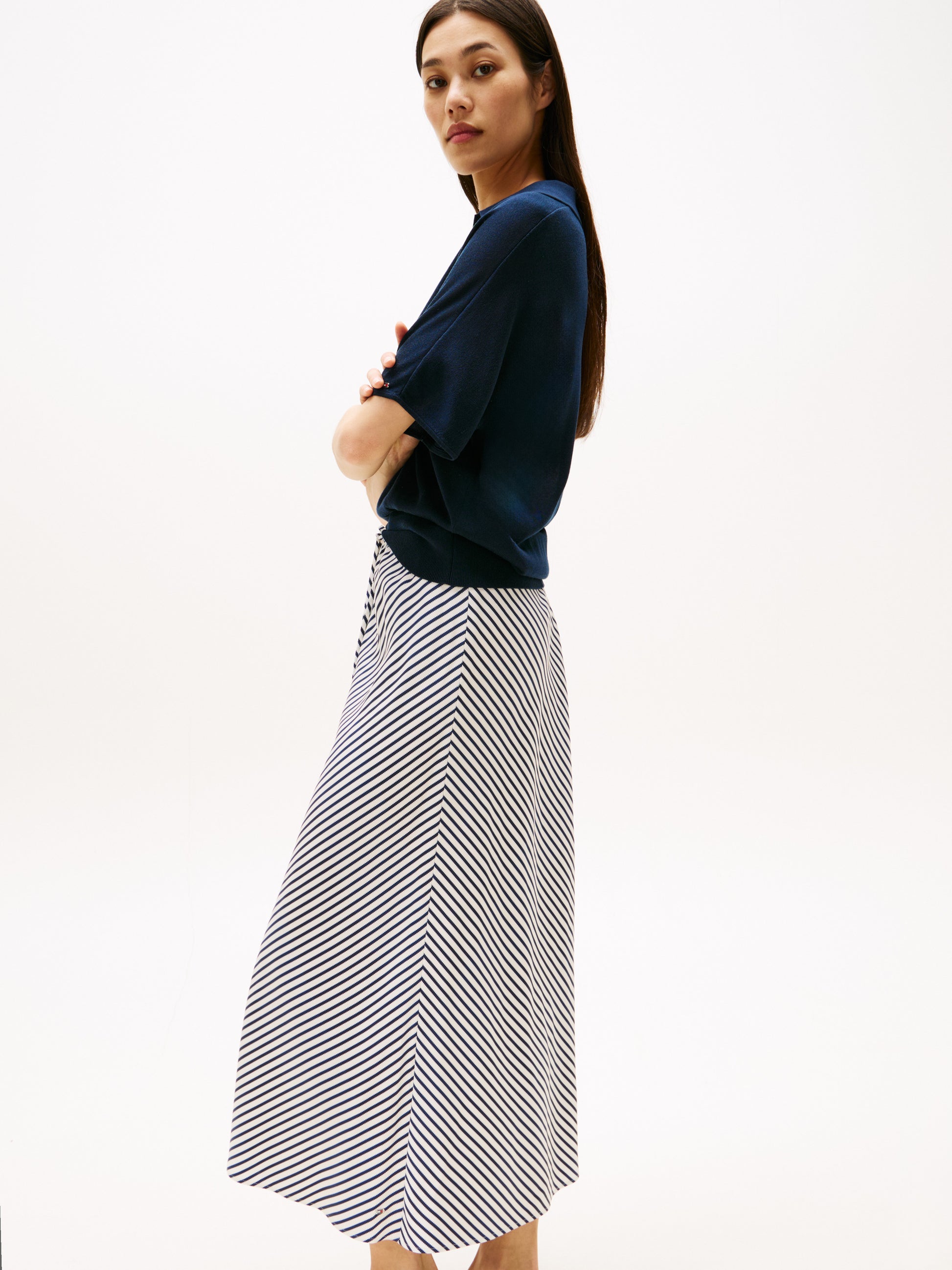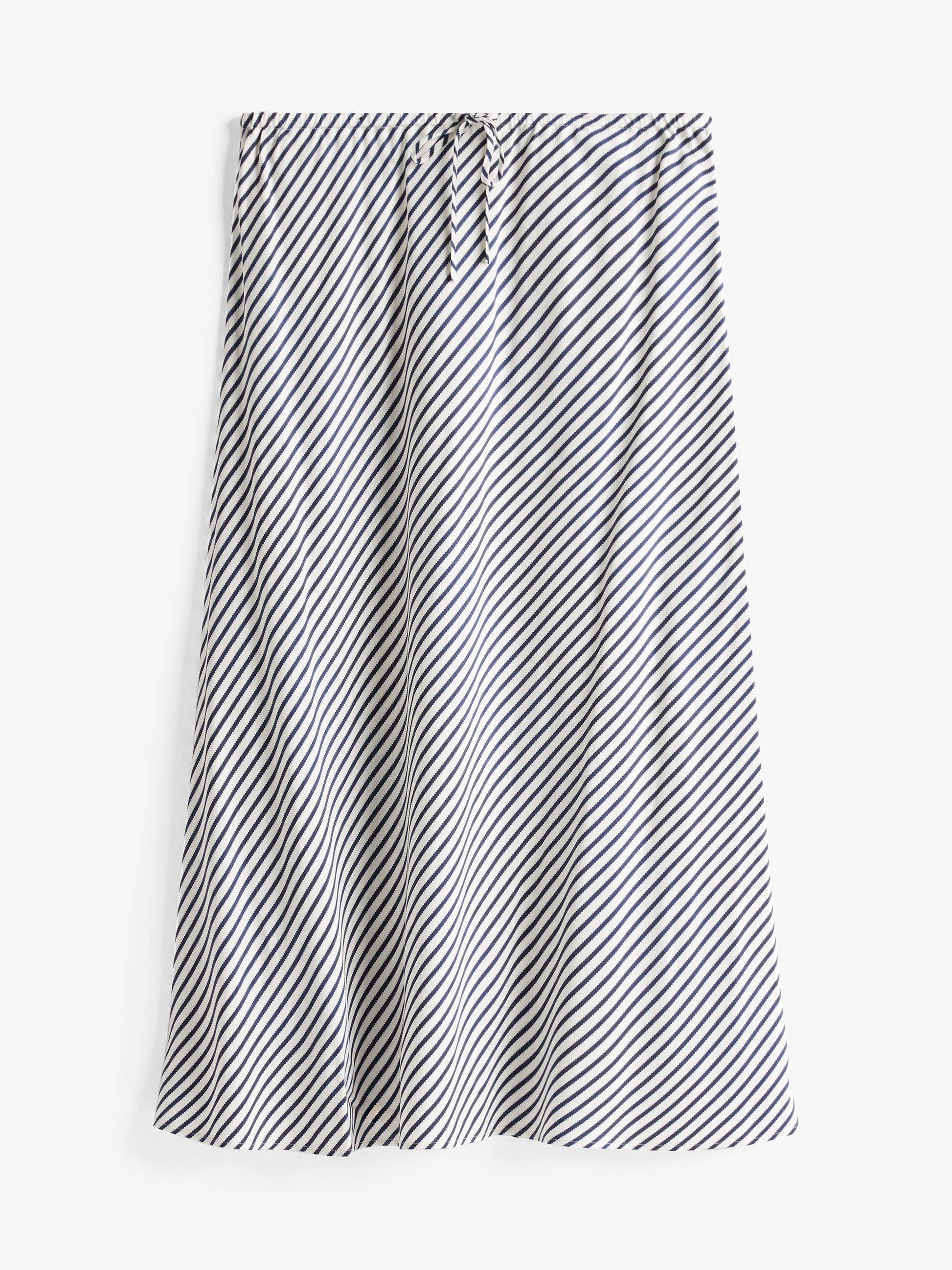 With its soft drape and bias-cut, this striped midi skirt moves beautifully with every step. The drawstring waist adds comfortable element.